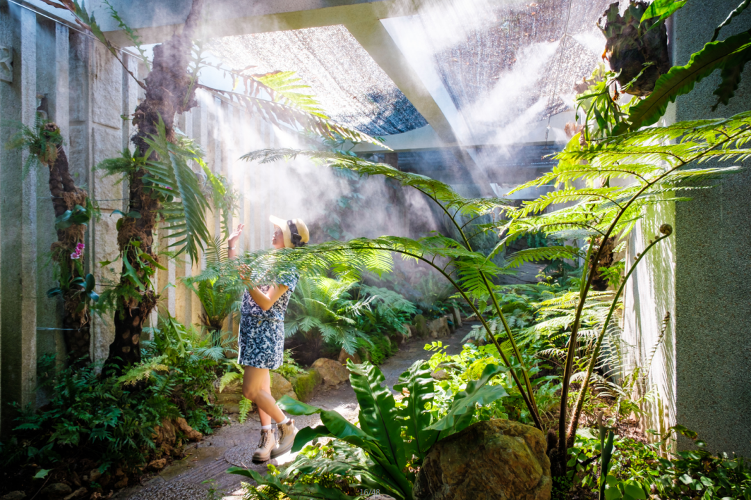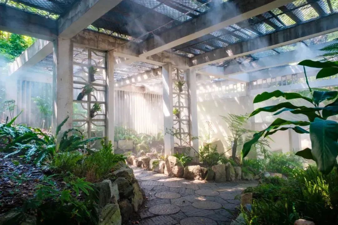 展区在依托原有建筑结构的基础上,通过搭建荫棚,增加大面积雾森系统等,营造出适合蕨类植物生长的湿润阴凉的环境,并以附生、嵌植、地栽等多种栽植方式,打造了一个错落有致、独特微妙的蕨类植物专区。#喷雾降温系统#人造雾#雾森系统