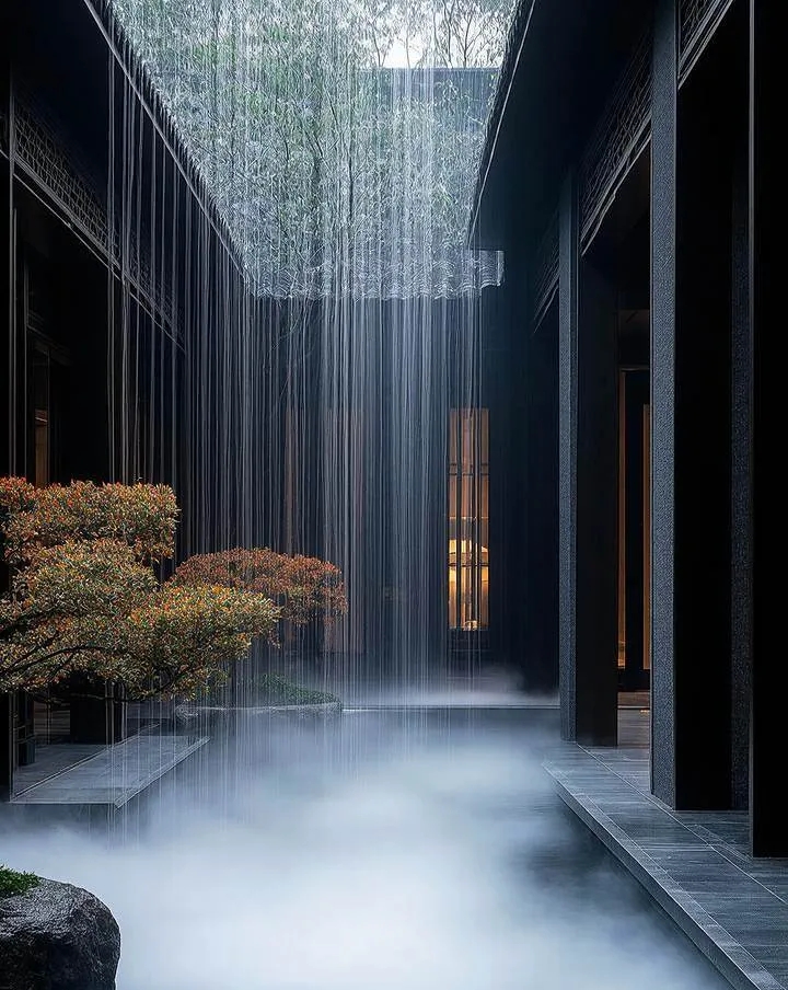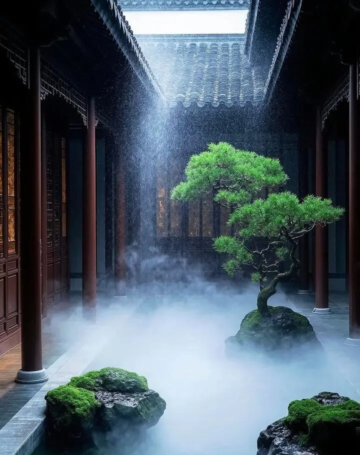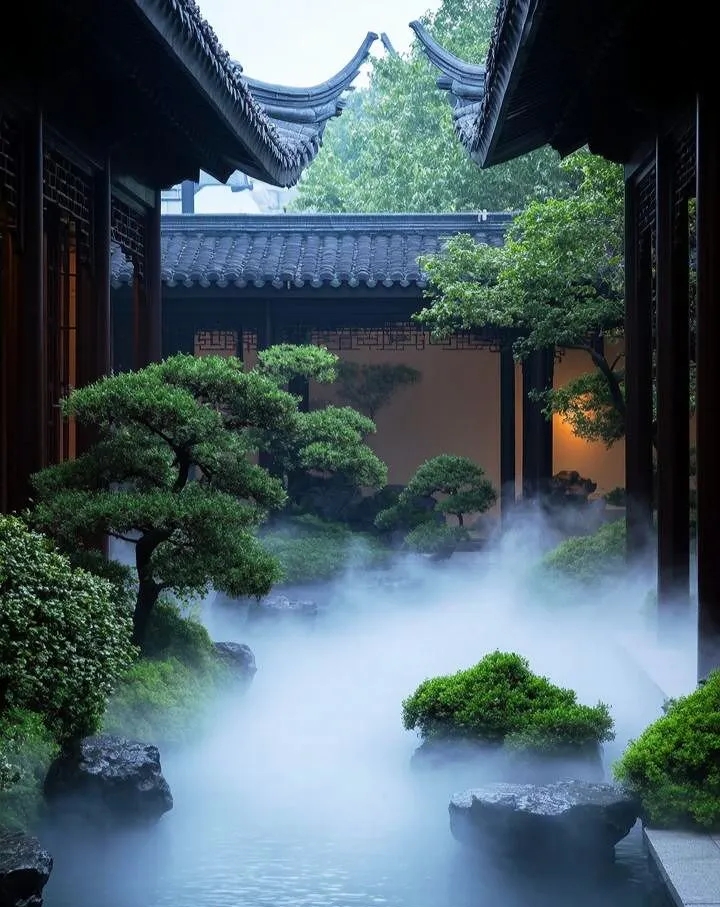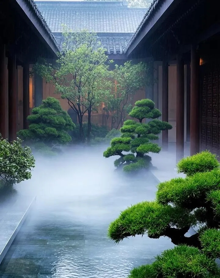 层次营造:通过雾气的虚实变化,可强化景观纵深感,使小院视觉扩大30%